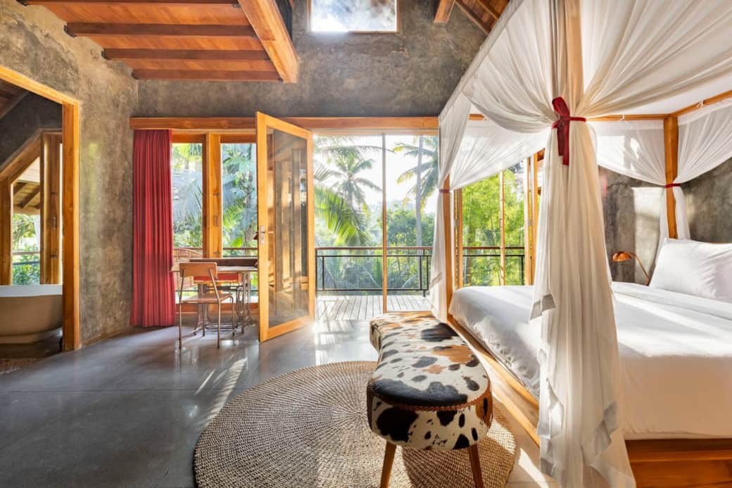 • Master Suite – Sink into a king-size bed with jungle views, a private balcony for slow mornings, and a queen-size loft nook above — a cozy hideaway for reading, daydreaming, or stargazing